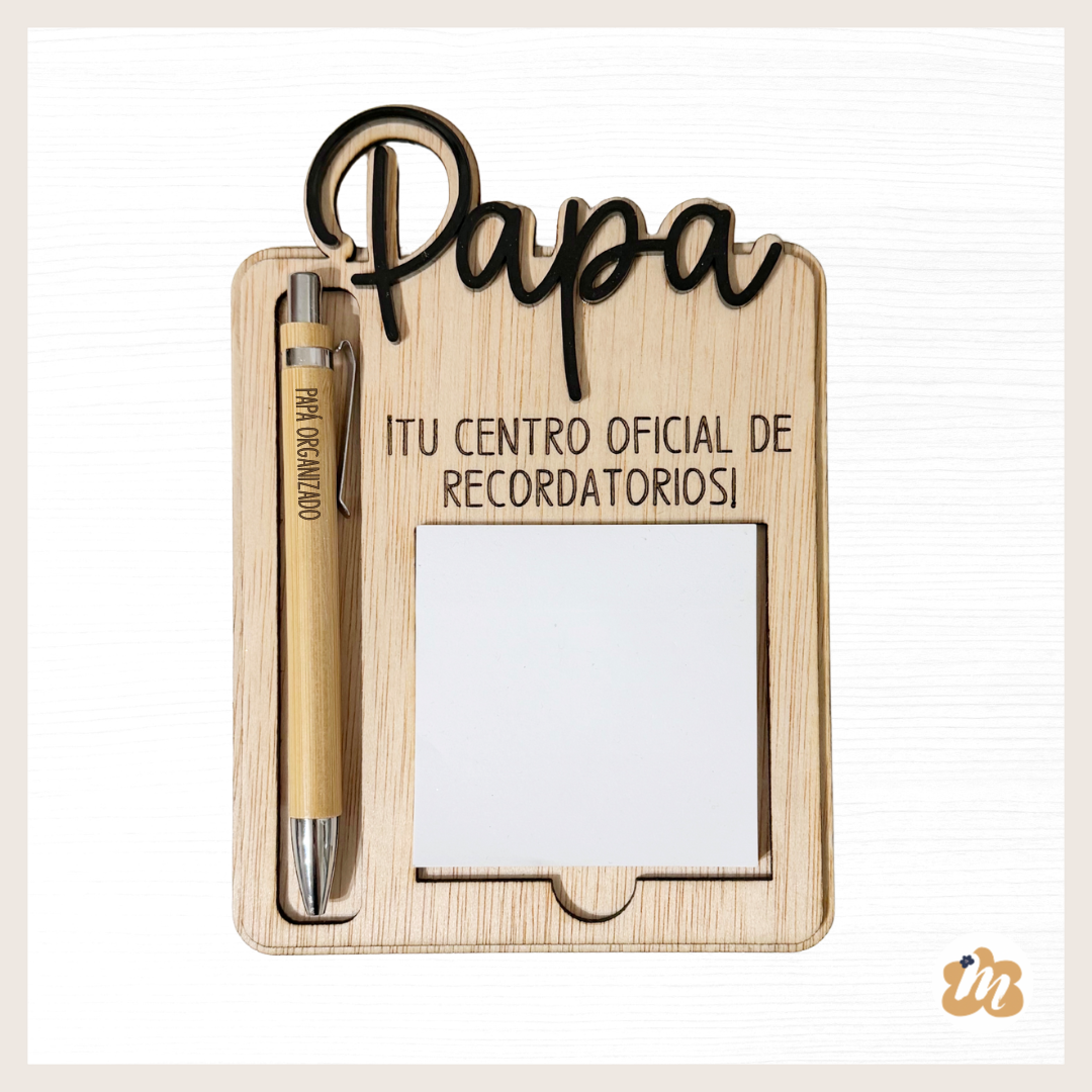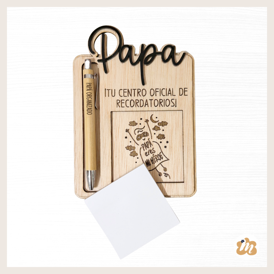 Este organizador de madera personalizado para papá combina bloc de notas y bolígrafo en un diseño práctico y decorativo. Perfecto para tener siempre a mano recordatorios, tareas o pequeños mensajes importantes.