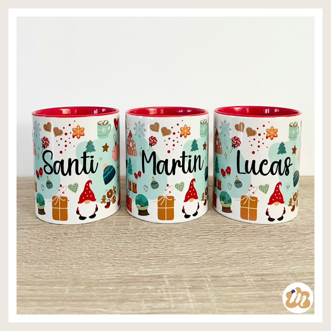 Taza navideña para toda la família. Interior rojo y asa roja en forma de corazón.